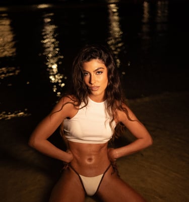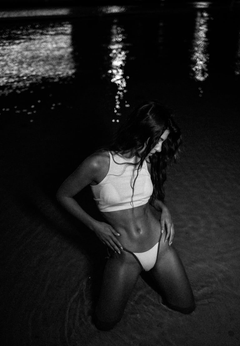 A bikini editorial exploring warm tones, urban surf culture, and coastal nightlife. Set between a kayak & surf shop and the shoreline after dark, the series blends heat, movement, and intimacy in a contemporary summer narrative.